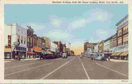 A view of Garrison Avenue, looking west from the 900 block; notice the sign at the far left hanging on the corner of Ninth Street and Garrison. It points to the Joie movie theatre on Ninth which burned in the early 1950s. Hand-tinted, this color image probably depicts the avenue sometime in the 1940s or 1950s. |