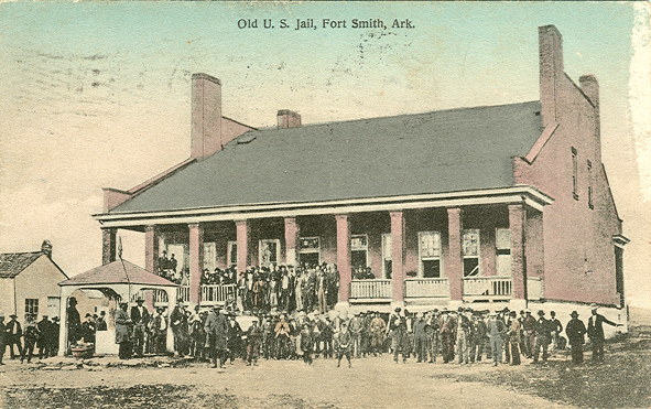 The U.S. Jail as pictured circa 1870s on a 1911 postcard was the soldiers' barracks prior to the Civil War. It became a courtroom and jail before Isaac C. Parker took over as federal judge of the Western Arkansas District and Indian Territory in 1875. All prisoners were kept together in the basement jail which was lice riden and rat infested. As many as 110 men were kept there at one time. Bad press reports of the jail eventually resulted in action taken to alleviate the terrible sanitary conditions. in 1887-1888. A new three-story brick building was constructed adjoining the court house. |