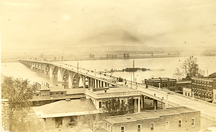 The Free Bridge or Garrison Avenue Bridge extended from Fort Smith to the Oklahoma border over the Arkansas River. This photo postcard of the bridge looks west into Oklahoma from Fort Smith during the flood of 1927. The Missouri Pacific Railroad pushed 25 cars of coal onto the bridge to keep it from being swept away by the flood waters. |