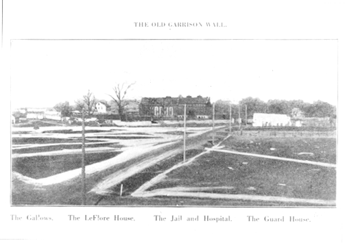 Although grainy, this image is one of the few views of the entire grounds of old Fort Smith, ca. 1890. Looking east from Belle Point, the buildings and structures shown here are gallows, left, the LeFlore House, the jail and guard house. In the 1870s, the site and remaining buildings of the second military fort was converted to use by the U.S. Court for the Western District of Arkansas and Indian Territory. It was here that Judge Isaac Parker presided as judge for almost 20 years. |