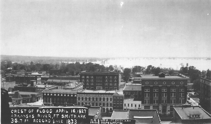 The roofs of buildings on the north side of the 300 block of Garrison Avenue are visible in the foreground followed by the fronts of the buildings on its south side. Behind them are buildings in the 300 block of Rogers Avenue and the flooded land south of the avenue during the flood of 1927. Left to right, the business in the buildings on the south side of Garrison are: Marland Refining Company Station number 16 (404); Fort Smith Seed Co. (322-324); Hotel LeFlore (316); Quality Seed Store (312) and Reynolds Davis Grocery Co. (300-306). The four-story Atkinson Williams building is visible in the 300 block of Rogers. |