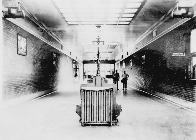 Special Officer Jno Tisdale stands to the left of assistant claim agent Julius Hoech in the concourse between the lobby, visible in the background, and the train yard. Union Station served Fort Smith from 1911 to 1966 when it was torn down to make way for the construction of the Fort Smith Municipal Auditorium. The Holiday Inn City Center (2007) stands about where it did in the 700 block of Rogers Avenue. |