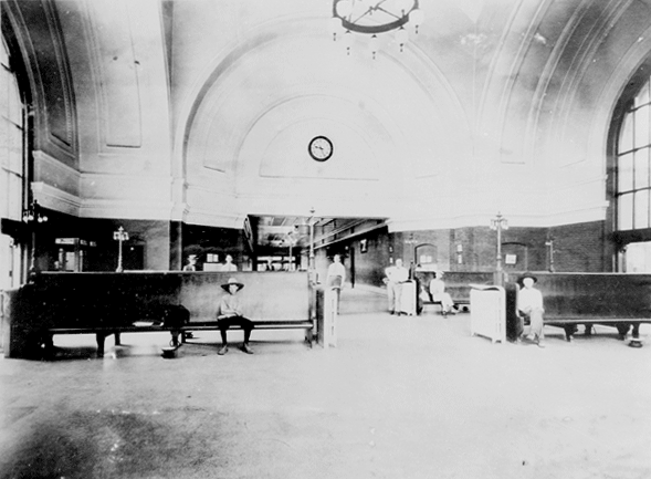 Assistant claim agent Julius Hoech stands leaning on a radiator in the Union Station lobby. Special Officer Jno Tisdale stands to the left of him. Union Station served Fort Smith from 1911 to 1966 when it was torn down to make way for the construction of the Fort Smith Municipal Auditorium. The Holiday Inn City Center stands about where it did in the 700 block of Rogers Avenue. |