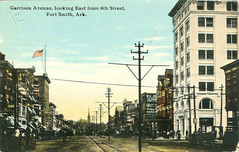 Looking east on Garrison Avenue from just west of North Sixth Street and Garrison, this image shows the First National Bank (multistory white brick) building and the Hotel Main on the right. Note the electric trolley tracks down the center of the street and the continued presence of wagons, dating this image to sometime in the 1910s. |