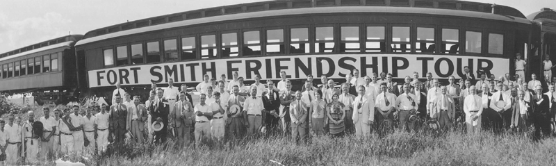 A Fort Smith & Western railroad coach stops in its tracks so its passengers can pose for this photo, probably in the late 1920s or early 1930s picture.