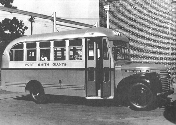 A couple of young fans sit on one of team buses the Fort Smith Giants, probably sometime in the 1940s or 1950s. The Giants were a minor league baseball farm team that was based in Fort Smith for many years and played at Andrews Field just south of the National Cemetery. |