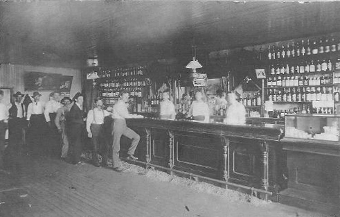 Inside the Tony Euper Saloon circa 1906, a number of men line up for drinks. Notice the absence of stools and use of the brass rail along the bottom of the bar. The owner may have been Tony Euper Jr.
