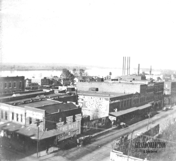 Downtown circa 1900 as seen from above the vicinity of North Third Street and Garrison Avenue looking northwest, this image shows many of the buildings that once stood on the side streets to the avenue but are gone now. Notice the houses of the Row area between the Arkansas River and the buildings in the foreground. For a closeup view of the Row houses, click here. |