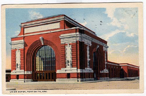 In this undated postcard image, the Union Depot stood on the south side of the 700 block of Rogers Avenue from 1911 to 1966. Today (2005), the Holiday Inn City Center occupies approximately the same ground.
