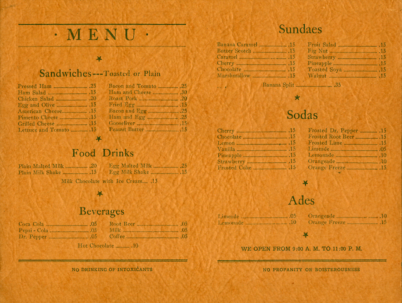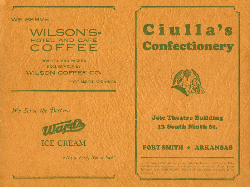 Ward's Ice Cream advertised on the menu's last page was made locally. This menu dates from around 1943. The Joie Theatre burned down in the 1950s.
