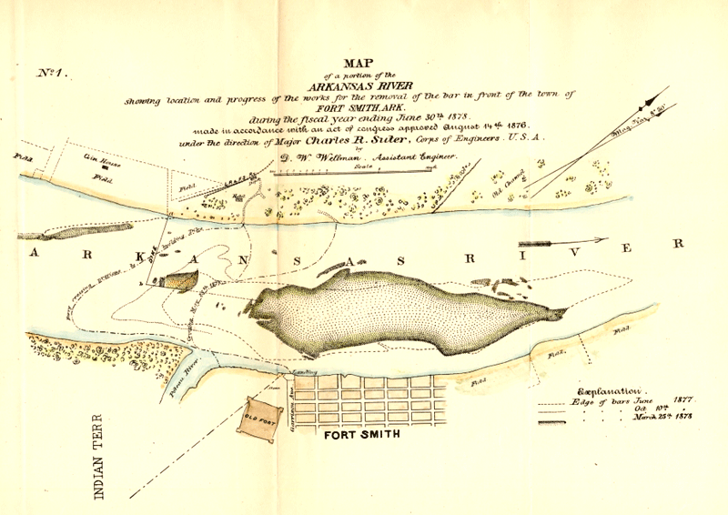 Before the completion of the McClellan-Kerr Arkansas River Navigation System in the 1960s, the Arkansas River was not navigable year round to and from Fort Smith. The seasonal flux of water flow often left the river shallow with large sandbars obstructing major portions of the Arkansas River. This map gives some indication of the scope of that problem in the 1870s near the city. |