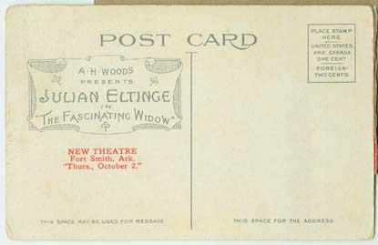 A promotional postcard for the New Theatre, reverse also is shown below. This may be from the period between 1911 and 1915 when the New had live performances. The New Theatre (also known as the old Malco Theatre) still stands near the corner of Garrison Avenue and North 10th Street. |