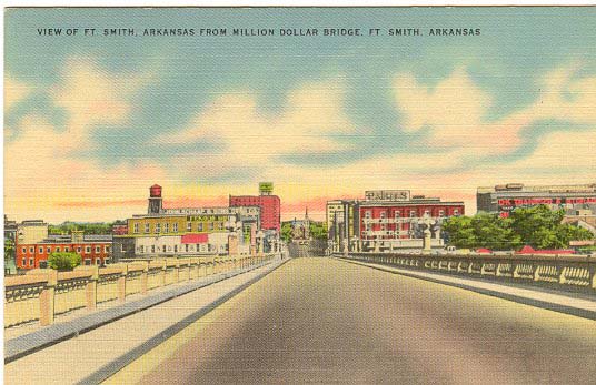 Looking west from the Free Bridge, construction of which was completed in May 1922, downtown Fort Smith is visible with Immaculate Conception Church, center, and the Ward Hotel located just to its left in the 500 block of Garrison Avenue. The Ward was completed in the late 1920s so this hand-tinted postcard was probably rendered at that time or after. |