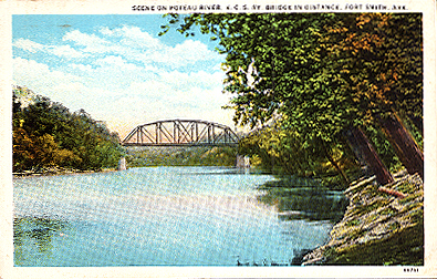 "Scene on Poteau River, Kansas City Southern Railway Bridge in Distance, Fort Smith, Ark." This image is undated. A postmark on the back reads 1937.