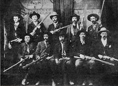 Ten members of the 17-member posse that killed Ned Christie in 1892. Standing, from left: Wes Bowman, Ab Allen, John Tolbert, Bill Smith and Tom Johnson; seated, from left: Dave Rusk, Heck Bruner, Paden Tolbert, Charles Copeland, and Captain G.S. White. They had to use a cannon and a half-dozen sticks of dynamite to blast him out of his hideout. Deputy Marshal Heck Thomas led the effort to get Christie. |