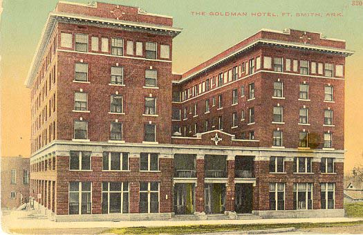 The Goldman Hotel is shown here before the third wing was added on the north side of the building. Often the Goldman is thought of as being a Garrison Avenue building because of how it, along with nearby Immaculate Conception Church, dominated the east end of the street. However, the main entrance of the hotel, seen here, fronted North 13th Street. The Goldman opened for business in 1911 and was demolished in 1994. For many years before its destruction, it had been vacant and largely abandoned. The hotel as named for Lesser Goldman, a St. Louis cotton broker and investor in the building. |
