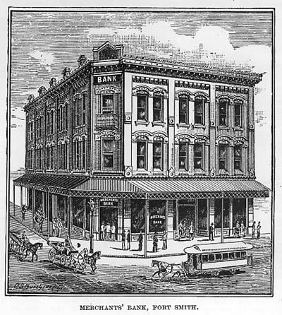 The old Merchants Bank in the Eberle building on the northeast corner of North Sixth Street and Garrison Avenue, circa 1887. The bank was founded in 1882 by William Joseph Echols. In 1907, it moved into new quarters at 623 Garrison, at the northeast corner of North Seventh Street and Garrison Avenue. It remained a core, Fort Smith financial institution until its purchase in the 1990s by a larger regional bank. |
