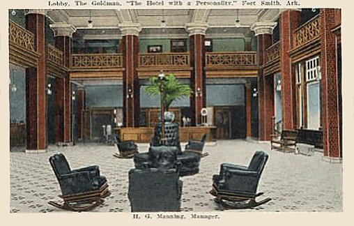 The lobby of the Goldman Hotel greeted visitors with a beautiful early 20th century decor. Although the lobby and hotel faced North 13th Street, the hotel was closely identified with the street on its south side, Garrison Avenue. Construction of the hotel was finished circa 1911 and for decades it was the social center for many of Fort Smith's residents as well as the city's guest. In 1994, the hotel was demolished to make room for more parking for nearby Immaculate Conception Church. |