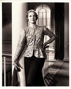 The elegance of grey and silver tinsel all-over lace combined with dull lustre heavy black satin one of Katherine Alexander's stunning dinner gowns from "She Married Her Boss", a Columbia picture. The jacket is fastened at the throat and waist with large diamond and sapphire clasps. Year: 1935 |